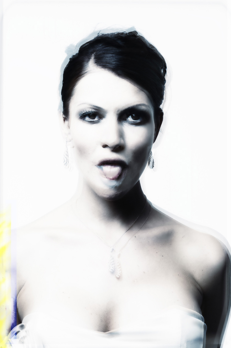 Im Wesen der Portraitfotografie liegt eigentlich das Bestreben, den Portraitierten in ein möglichst gutes Licht zu rücken, damit seine (oder ihre) Charaktereigenschaften zu betonen und ihn vorteilhaft aussehen zu lassen. Dieses implizite Ziel des Portraits unterläuft Sven Lorenz bewusst mit seiner Serie „Causal-Effect“, bei der er Situationen bei Shootings, aber auch auf dem „roten Teppich“ eingefangen hat. Die von ihm abgelichteten jungen, attraktiven Frauen haben für die Fotos mehr oder minder intensiv mit ihm zusammengearbeitet. Man könnte ein Brautportrait ebenso in eine Fotografie hineindeuten wie ein besonderes Geschenk in eine andere, während die unnahbare Schöne sicher mit den übrigen Promis geladener Gast war und an den Schaulustigen nonchalant vorbeistolzierte – bis sie in den Fokus von Sven Lorenz kam, der sich ihr in den Weg stellte, sie so lange nervte, bis sie für einen kurzen Moment die Beherrschung verlor und ihm im Affekt die Zunge rausstreckte. Ätsch – da war’s ein Bild. Das eigentlich Erstaunliche ist aber, dass – auch wenn das Rausstrecken der Zunge das Gesicht in seiner Symmetrie stört – mehr vom Frechen, weniger Hässliches transportiert wird. Denn im Unterschied zur wutverzerrten Fratze impliziert die rausgestreckte Zunge eben doch auch ein spielerisches Moment, ist der Akt des Rausstreckens gewissermaßen eine Befreiung von der vorgeschriebenen Norm. Mit diesem Moment spielt nun wieder Sven Lorenz, indem er mindestens zwei Fotografien derselben Person übereinander montiert und mit digitalen Reglern weiter verfremdet. Die Portraitierten werden deshalb unscharf, das „normale“, situierte Bild und das „freche“ überlagern sich, der Charakter der Person schimmert unter der Rolle, der Haltung – letztlich: der gesellschaftlich verordneten Maske, die wir Konvention nennen – hervor.